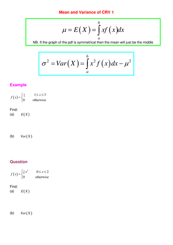 The median of a continuous random variable having distribution function F is that valuemsuch that F m 1 2 F m frac 1 2 F m 2 1 That is a random variable is just as likely to be larger than its median as it is to be smaller. Its equal to 2915 SQRT 85. In this tutorial you are shown the formulae that are used to calculate the mean EX and the variance VarX for a continuous random variable by comparing the results for a discrete random variable.